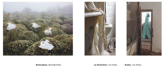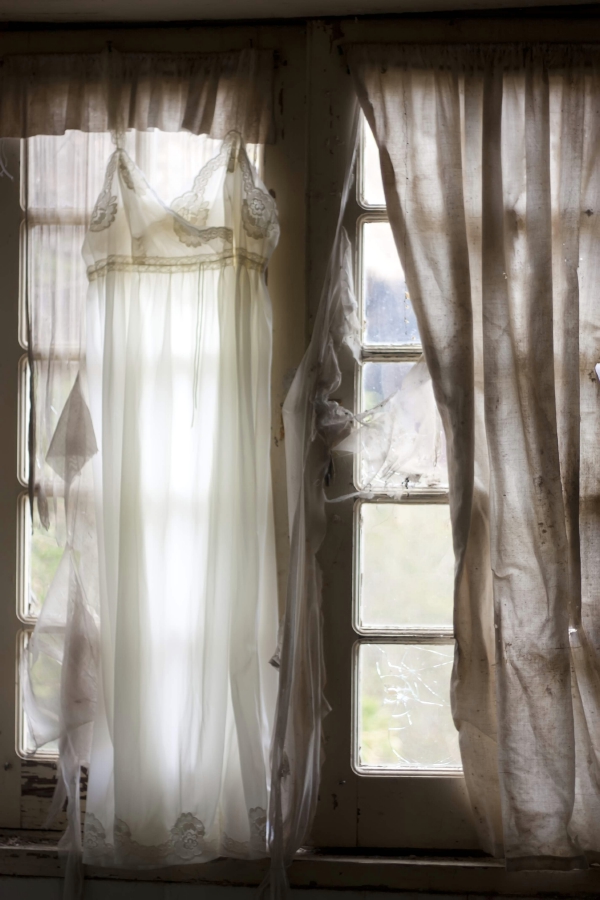 Quizás la historia de Monique fuera así, el descubrimiento de un baúl, que marcó su “estar en el mundo”, su anclaje a un pasado, a un hogar, a una vida. Una búsqueda constante de un posible reencuentro con sus recuerdos a través de los vestidos, una memoria familiar que habita el paisaje evocando estados de nostalgia y melancolía. Estados del alma, que desvelan cada una, de sus imágenes. Pues la luz que los envuelve, evoca estados de introspección, invitándonos a ese otro mundo soñado. Ese halo etéreo, romántico si cabe, que inunda sus imágenes, convierte sus vestidos en testigos mudos de otros tiempos, incitándonos a reconciliarnos con nuestro pasado. Vestidos que a veces se desvanecen en el paisaje creando formas fantasmagóricas. Pues tanto en la naturaleza, como en esos otros paisajes vividos y hoy abandonados, es donde la artista crea una atmósfera envolvente, etérea a la vez que misteriosa. Estados oníricos que nos son regalados a la vista, pues sólo a través de sus imágenes, Monique Hoffman se desnuda, en silencio ante el paisaje.
