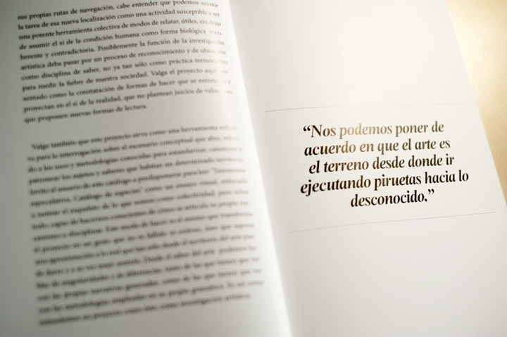 El territorio se modifica y reconfigura, de igual manera que los habitantes del mismo se transformaran para terminar de identificarse y enmarcarse en él. Una sociedad es una organización de significaciones concretas y particulares, directamente influidas por su contexto, pero no solamente como efecto de éste, sino también como parte formal del paisaje mismo. Taxonomía especulativa pretende que el territorio fun­cione de manera autoreferenciante, extendiendo una retícula de sujetos explorando la dimensión visual del individuo como parte del paisaje. Entendido como aquello que forma parte en nuestro campo visual al observar un territorio, el paisaje no solo hace referencia a la geografía, sino también al entorno social como configurador de este.
