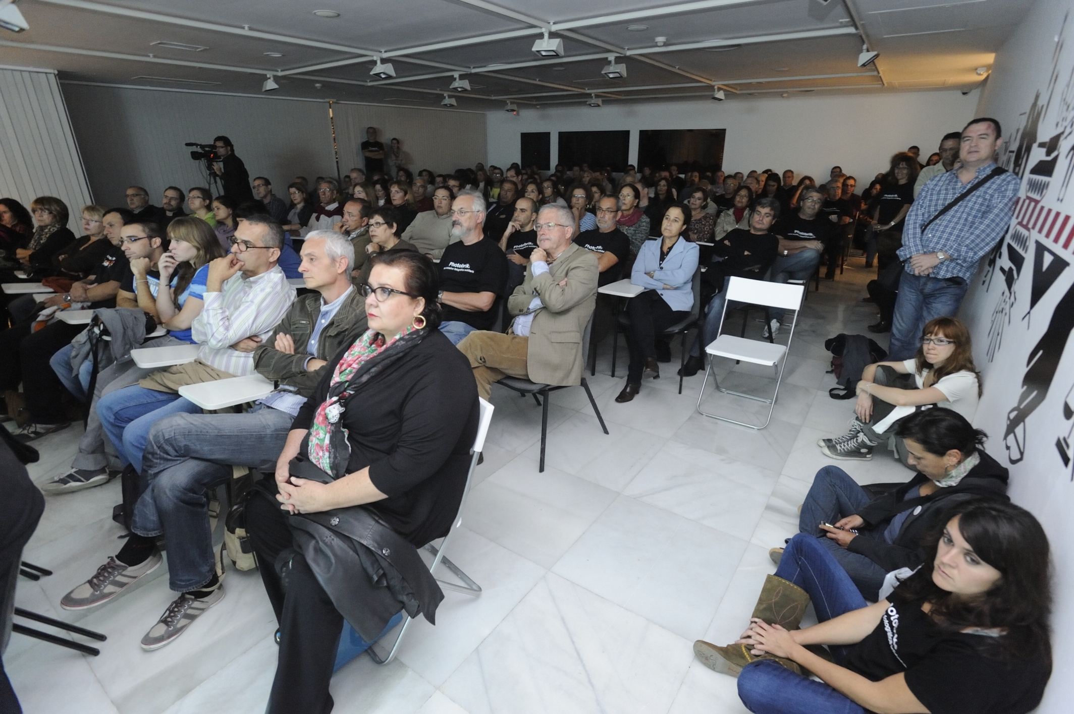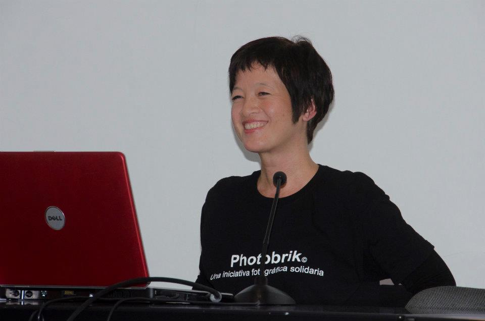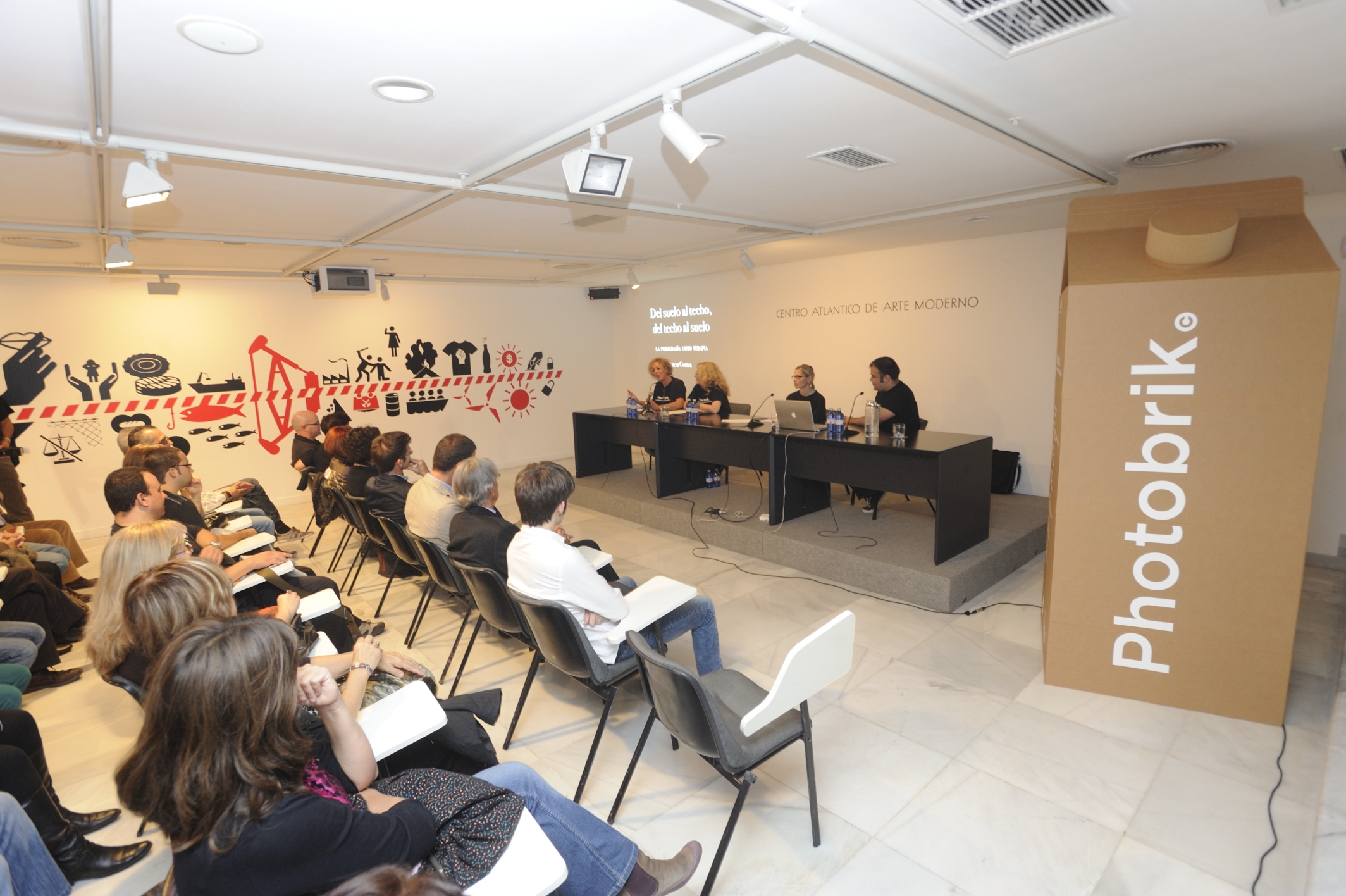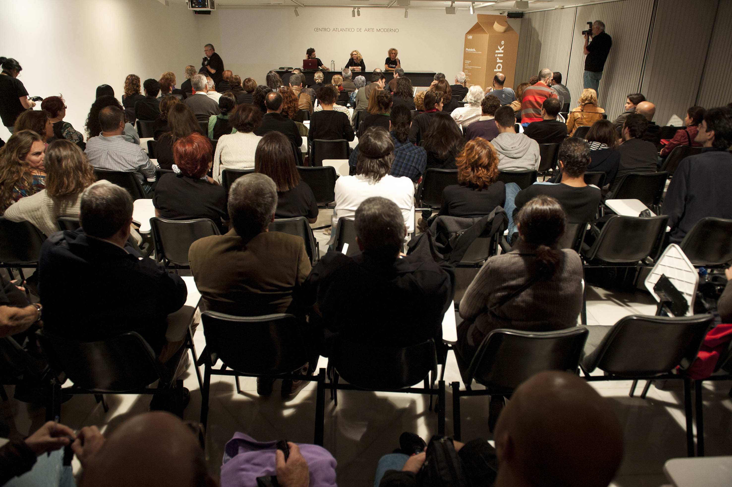 La fotógrafa TERESA CORREA inaugura en el CAAM, Photobrik con su conferencia » Del suelo al techo y del techo al suelo. La fotografía como terapia «.  Una sala desbordante de público, sorprendió a los organizadores, superándose el aforo de 120 plazas con cerca de 180 personas. Una respuesta solidaria y comprometida por parte de todos los asistentes que a su vez, duplicaron sus aportaciones de tetrabriks.